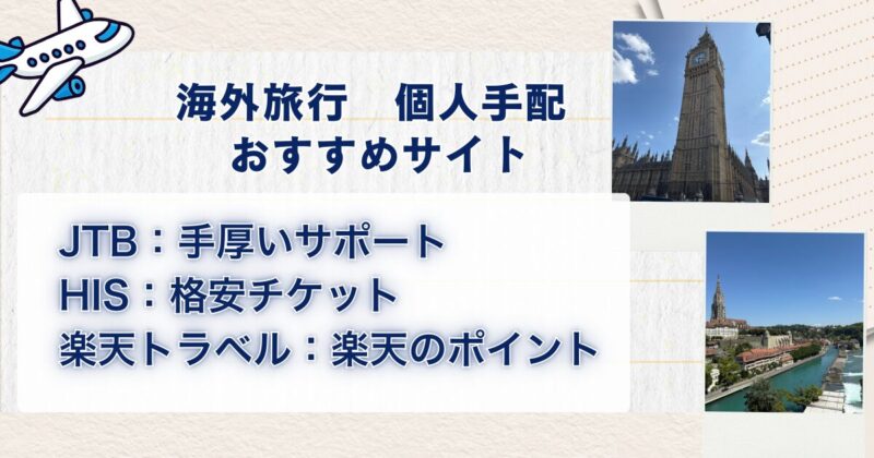この記事では、学生時代をアメリカで過ごし、子どもが生まれてから8カ国14都市に旅行をした私が今までの経験からわかった個人手配で海外旅行に行く時のおすすめサイト【JTB】【HIS】【楽天トラベル】についてお伝えします。