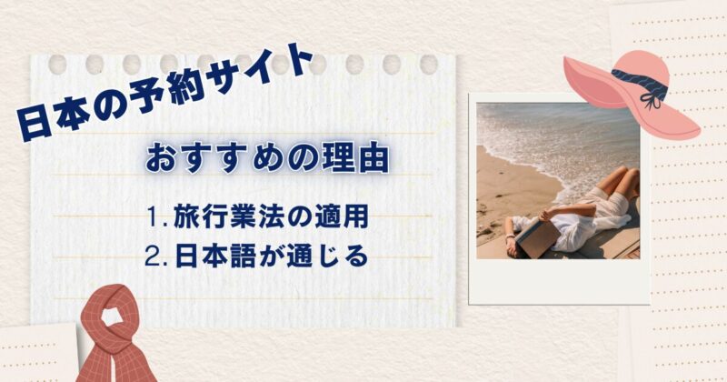 慣れない海外旅行の時は、「日本語サポート」「キャンセル規定」「問い合わせ窓口」の点から日本の大手旅行会社のサイトをおすすめします。